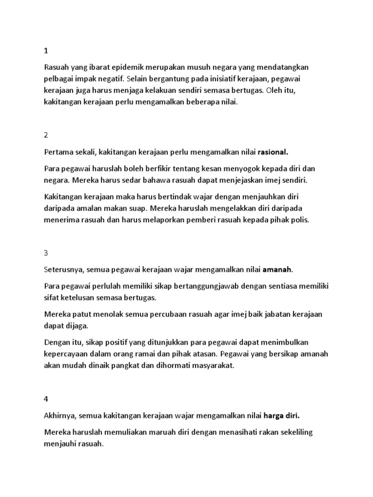 Nilai patutu mangamalkan untuk menggelakan gejala rasuah. Hal ini dikatakan demikian kerana pihak kerajaan melalui agensi SPRM perlu mengambil tindakan yang lebih agresif tanpa mengira pangkat dan kedudukan dalam melaksanakan tugas kerana anggota SPRM merupakan sebuah badan bebas yang dilantik. Apa yang penting di sini ialah kita hendak tahu puncanya katanya. Rasuah bermaksud sogokan atau bermaksud pemberian wang untuk menyogok sesuatu perkara dapat disembunyikan atau untuk membuat sesuatu dengan ringkas dan cepat tetapi salah di sisi undang-undang negara.