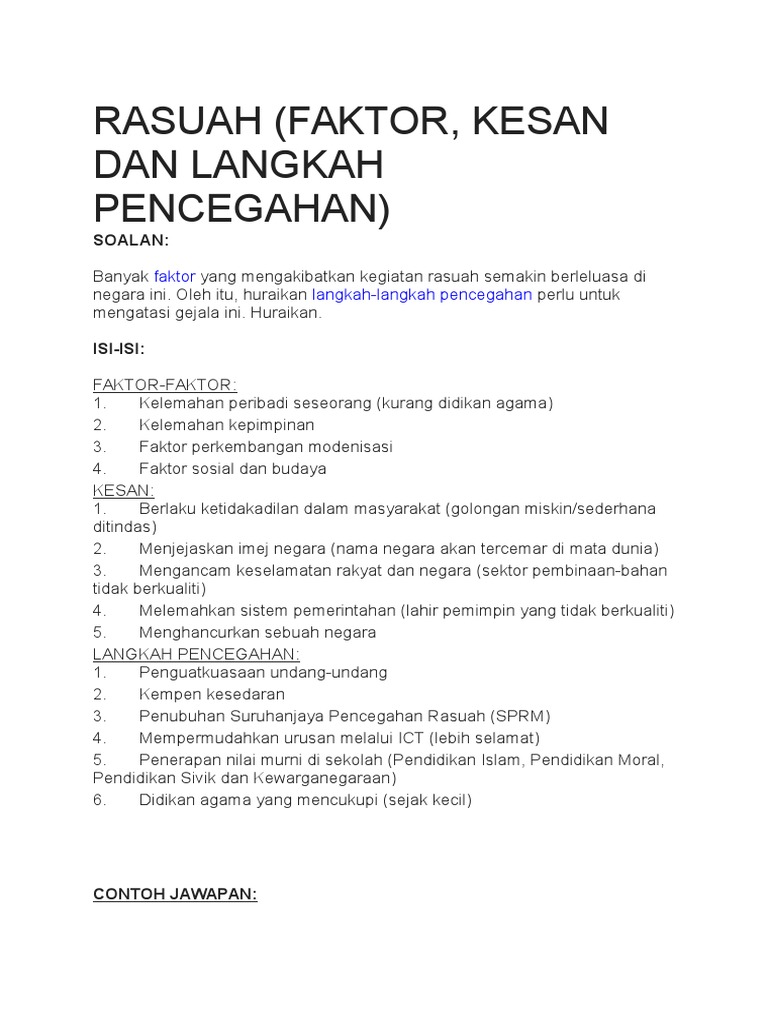 Rasuah Faktor Kesan Dan Langkah Pencegahan Soalan