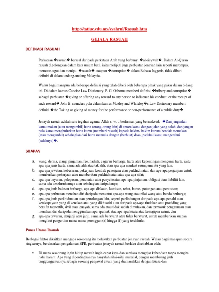 05062019 Gejala rasuah merujuk kepada perbuatan menyogok seseorang dengan wang atau barangan agar orang yang disogok dapat menggunakan kuasa atau kemampuannya untuk menyelesaikan sesuatu tugas secara tidak amanah. 13032017 Kerajaan akan kekal komited dalam menangani gejala rasuah dalam kalangan kakitangan Kerajaan supaya isu ketirisan dan pecah amanah dapat ditangani. Tetapi jika undang-undang hanya berstatus dokumen bertulis tidak dikuatkuasakan ia tidak mungkin menjadi senjata berkesan untuk memberi kemenangan dalam medan perang menghadapi rasuahPelbagai.